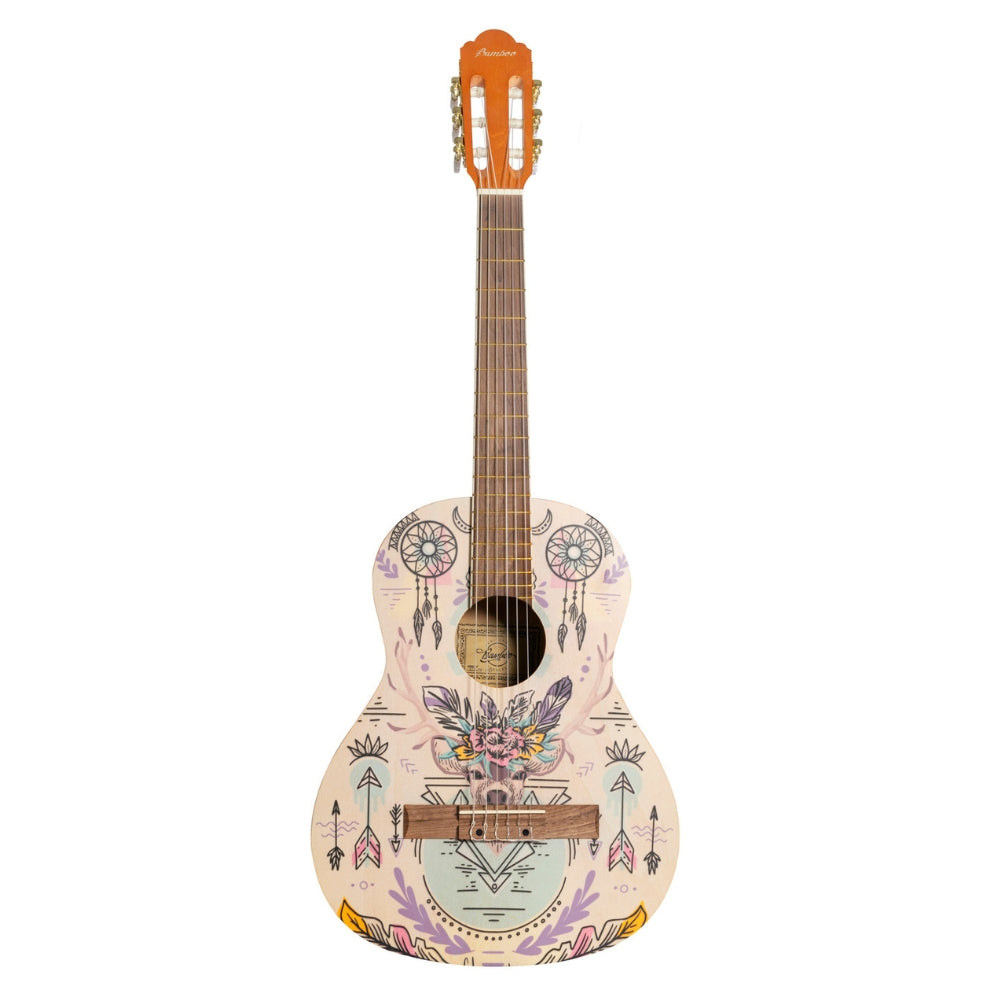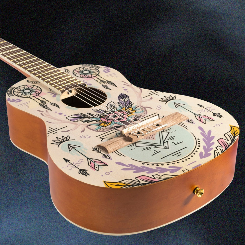 This guitar blends indie charm with classical tone. Built with Linden wood for both the top and body, it has a warm, balanced sound that’s great for beginners and pros alike. The walnut fingerboard feels smooth under your fingers, and the ox bone saddle helps your strings ring out clearly. It’s also tuned in open tuning, giving you new ways to play and explore your creativity.