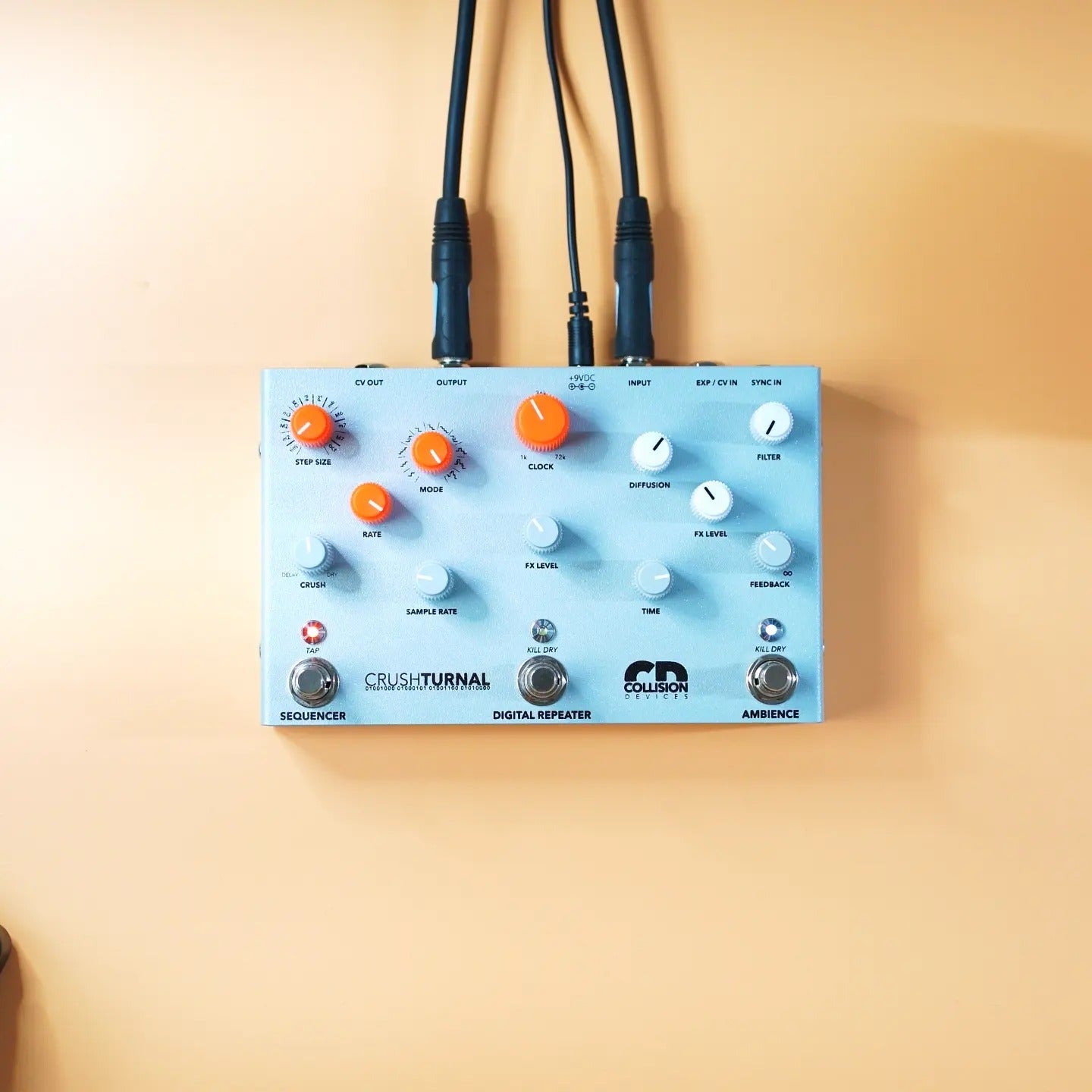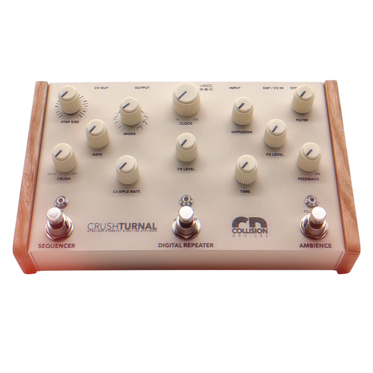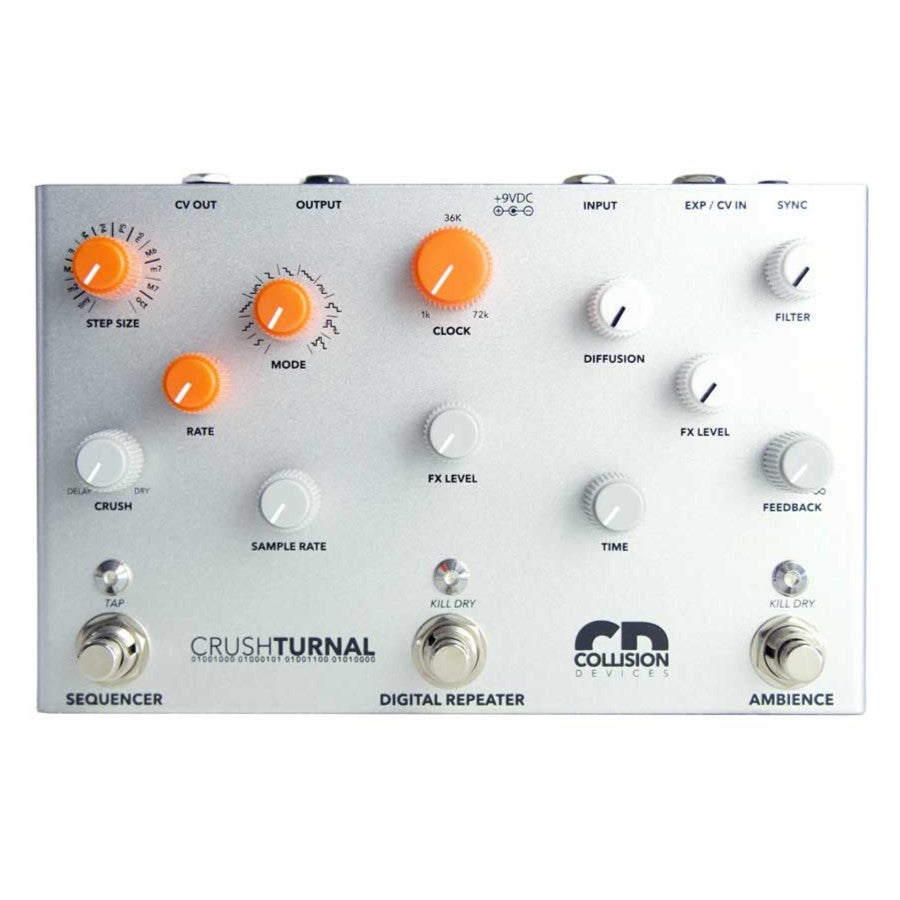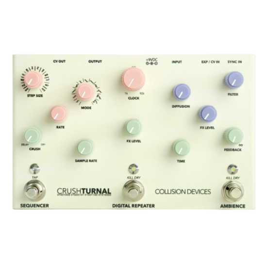 Crushturnal from Collision Devices is a versatile pedal that combines digital delay, sample rate reduction, and reverb, all enhanced by an onboard sequencer. This powerful tool allows you to explore a vast array of textural harmonies and ambiances while manipulating the global clock rate for angular modulations and randomized timbral shifts. Divided into three interconnected sections, Crushturnal delivers massive reverberations, crisp digital delays, and aggressive sample reduction, making it ideal for ripping audio apart.