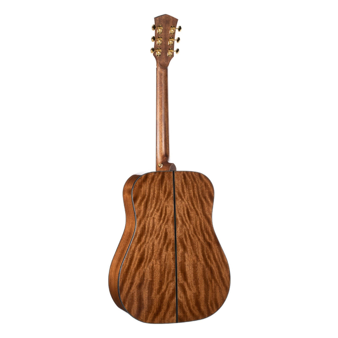 The GOLD-D6 features a torrefied solid Sitka spruce top treated with Cort’s Aged to Vintage (ATV) process, giving it the tone and resonance of a decades-old instrument. Combined with solid mahogany back and sides, hand-scalloped bracing, and a comfortable neck profile, it produces a big, open sound with rich mids and clear highs. It’s also equipped with Fishman Flex Blend electronics, making it ready for both studio and stage.