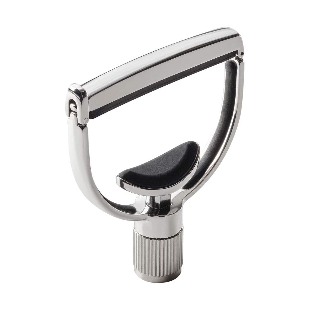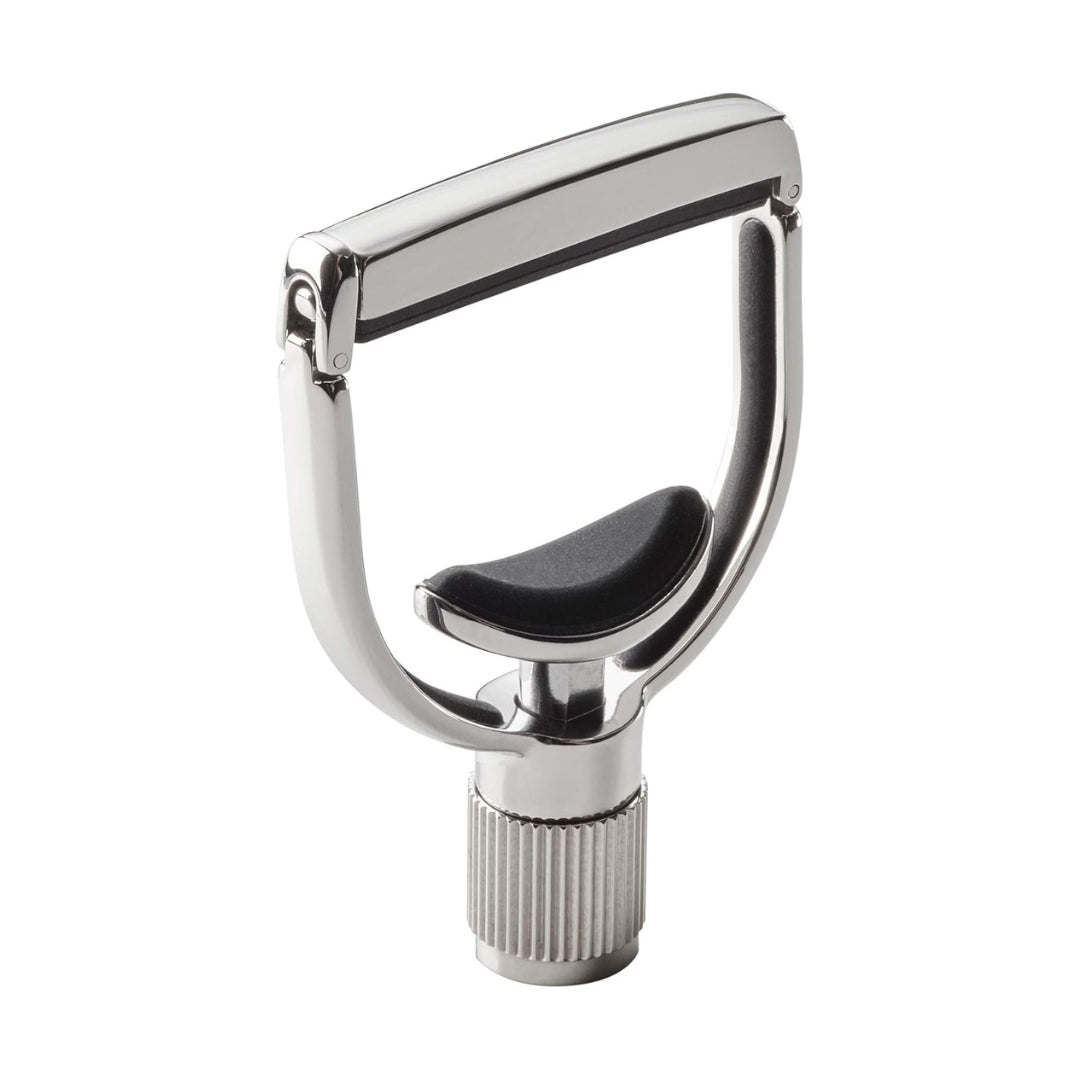 This yoke-style capo is crafted from hand-polished stainless steel for a high-end feel and long-lasting use. It features G7th’s Adaptive Radius Technology (ART), which adjusts to the curve of your banjo’s neck for a perfect fit every time. A knurled tension knob gives you total control, and silicone padding protects your instrument from scratches. When you're not using it, just tuck it behind the nut—it stays out of the way but always close by.