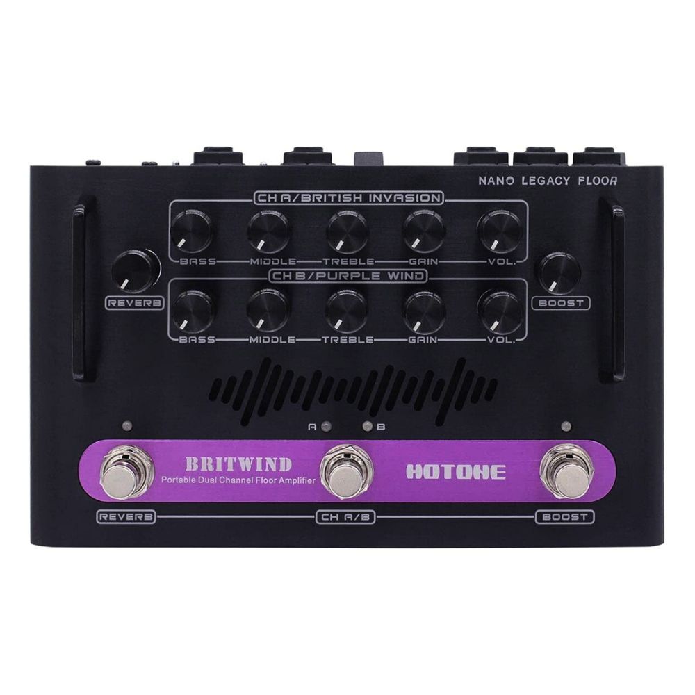 The Nano Legacy Floor Series includes two portable dual-channel floor amplifier models: BritWind and Mojo Attack. The BritWind features the sound characteristics of Hotone's British Invasion (inspired by the legendary Vox AC30) and Purple Wind (inspired by the legendary Marshall PlexiSuper Lead 1959) Nano Legacy Series amp heads on separate channels. Similarly, the Mojo Attack combines the characteristics of the Mojo Diamond (inspired by the legendary Fender Tweed) and Heart Attack (inspired by the legendary Mesa/Boogie Rectifier) amps.