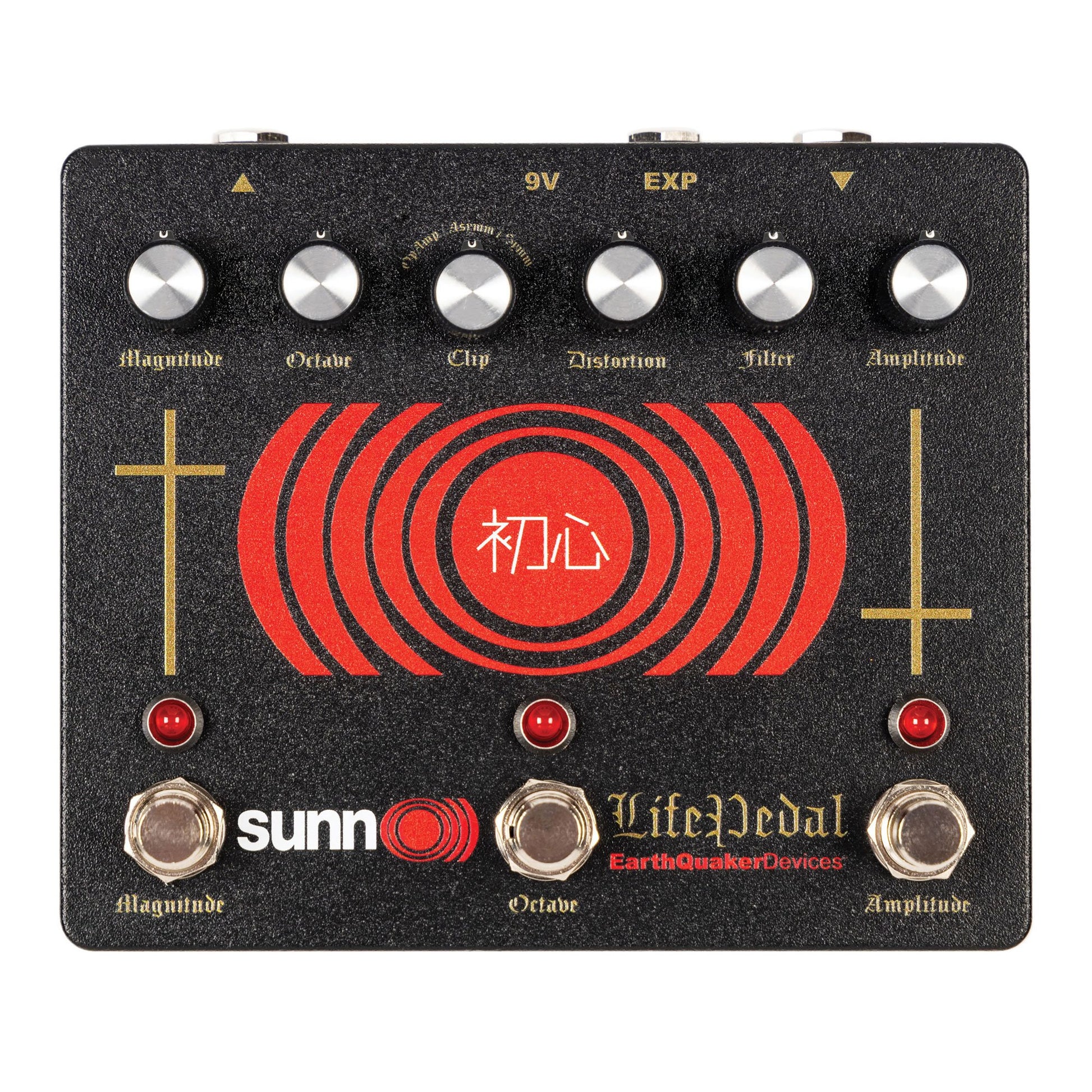 The Octave in the Sunn O))) Life Pedal is an all-discrete, analog full-wave rectifier base on a classic vintage design. Located at the input of the circuit, the Octave control slowly blends in the octave effects as you turn it clockwise. This feature can also be used via expression control allowing for wild, hands-free octave swells mid-riff. The octave is tied to the distortion circuit and can only be used if the Amplitude is active. Because this is an analog octave effect, it is monophonic and works best playing single notes above the twelfth fret while using the neck pickup. Playing chords with the analog octave will sound clanging and chaotic. Using the bridge pickup and playing below the twelfth fret will produce a very subtle octave effect. Going full Octave transforms Sunn O))) Life Pedal from a simple distortion device into a swelling, raging fuzz similar to the classic Super Fuzz!