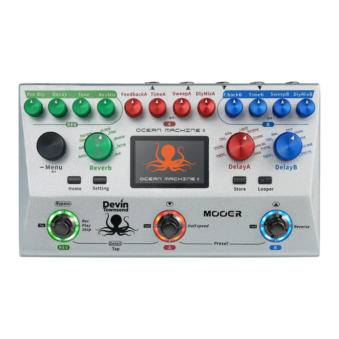 The MOOER Ocean Machine II takes everything great about the original and enhances it with upgraded features. It comes with two delay modules, a variety of reverb types, and a longer looper with 120 seconds of recording time. You can easily control these effects with an intuitive LCD screen and adjustable knobs, making it simple to shape your sound. Plus, with the ability to save your favorite settings as presets, this pedal is perfect for both live performances and studio work.