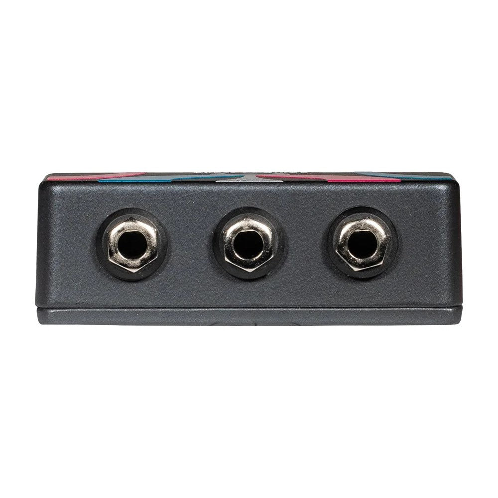 Split Meld is a box that connects two TS (mono) connections to one TRS (stereo) connection. It is helpful in stereo setups when one stereo element uses a TRS connection and another stereo element uses two TS connections. Signals remain separate and unaffected by each other, only the connection type is changed.