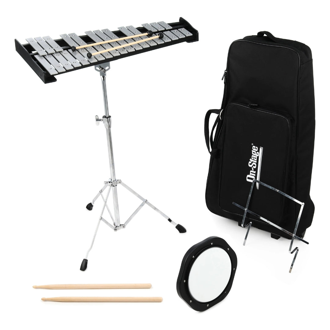 Whether you're just starting out or already playing gigs, the On-Stage Bell Kit makes learning and practicing fun and easy. With shiny metal bells that sound bright and cheerful, this kit is super easy to set up and take down. It even comes with a practice pad so you can work on your drumming quietly at home. And when you're done, everything fits in a carry case that you can roll like a suitcase or wear like a backpack.