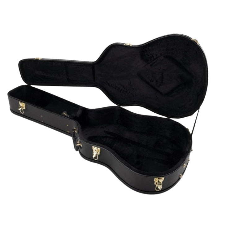 Built for both six and twelve-string acoustic guitars, this case is custom-molded to fit most body shapes perfectly. It features durable plywood construction with a sleek black vinyl cover, soft black plush lining to prevent scratches, and gold-plated hardware that adds a classy touch. With a locking center latch and internal storage for picks or capos, it's a solid choice for players on the move.