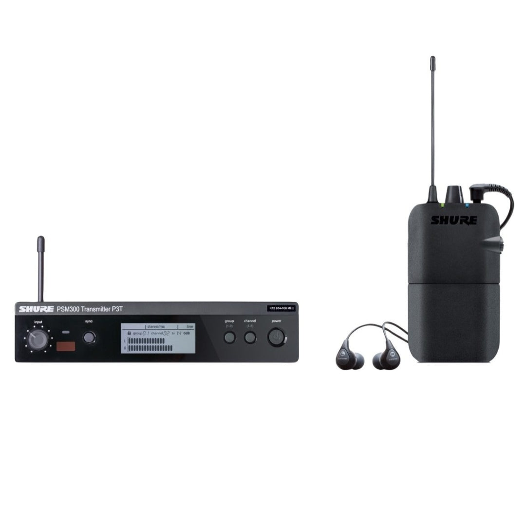 - System includes P3T Transmitter, P3R receiver, and SE112 earphones