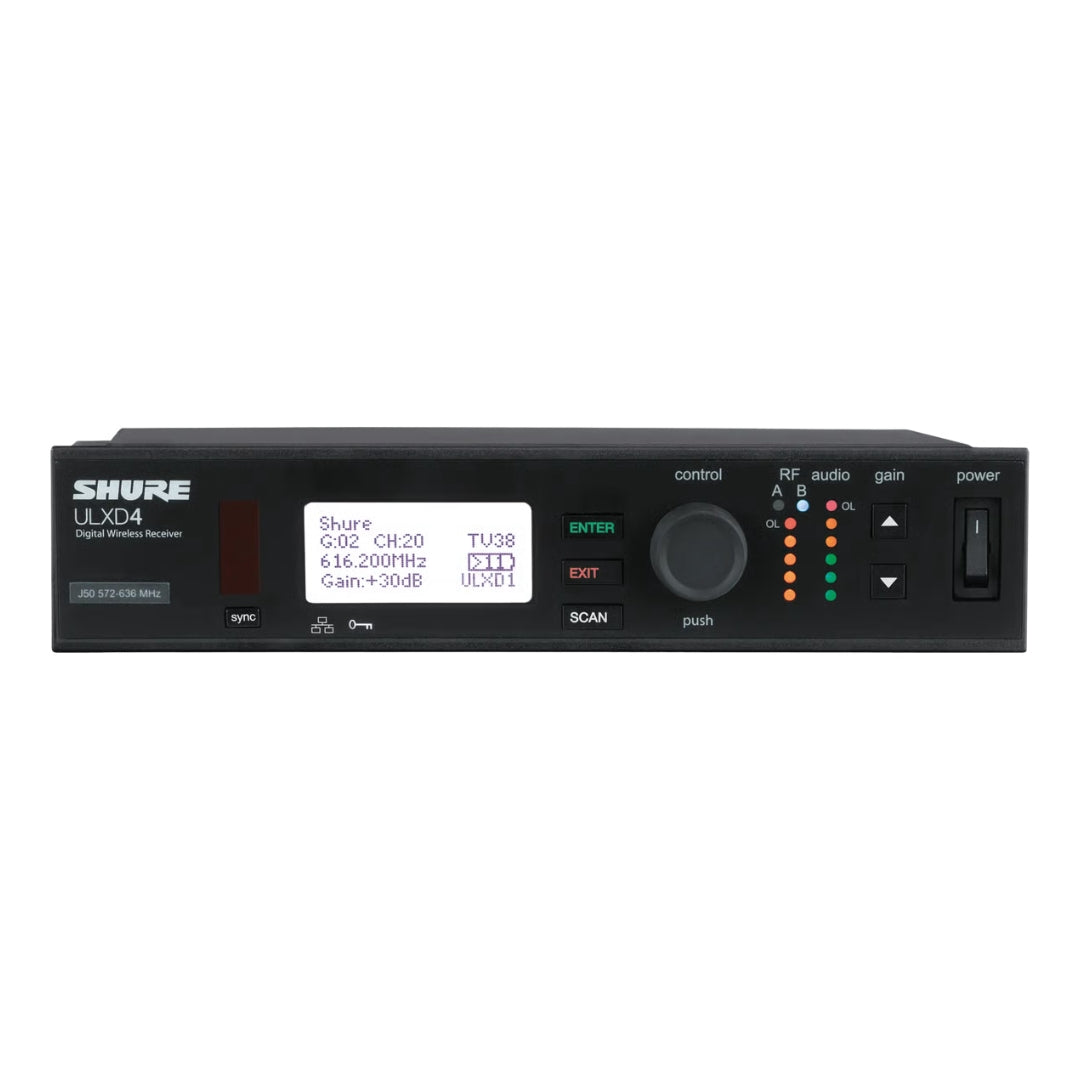 - Shure ULXD4 Single-Channel Digital Wireless Receiver (J50A: 572 to 608 + 614 to 616 MHz)